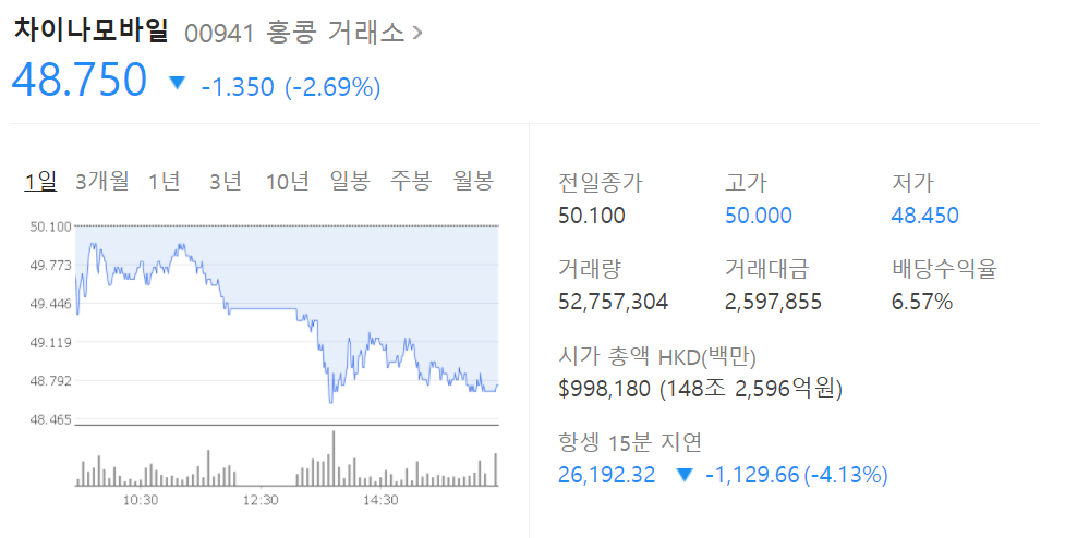 차이나모바일도 그간 상승분 전부 다 반납.