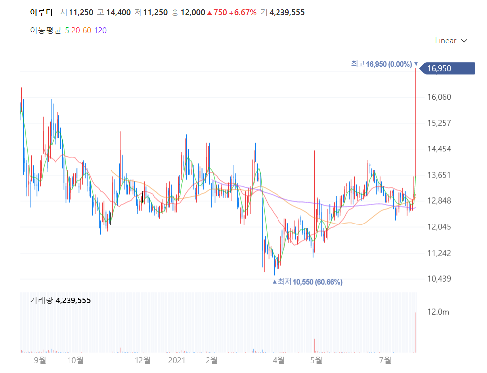 오늘 상한가를 간 종목 중에 이루다 라는 종목이 있어서 살펴보았다.