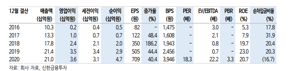 2020년 기준 매출액 210억원(-1.7% YoY), 영업이익은 36억원(+2% YoY, OPM 17.1%)을 달성했다.