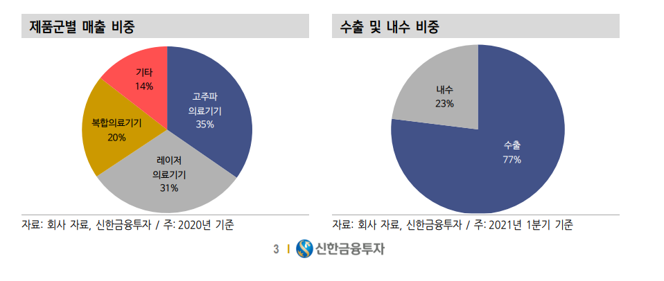 제품별 매출액 비중은 고주파 장비 35.4%, 레이저 장비 31.3%, 복합 장 비 20.5%, 기타 14.6%이다.