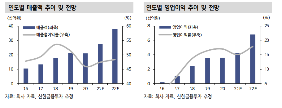 2021년 매출액 및 영업이익은 각각 277억원(+31.7% YoY, 이하 YoY 생략), 42 억원(+16.7%, OPM 15.1%)로 추정.