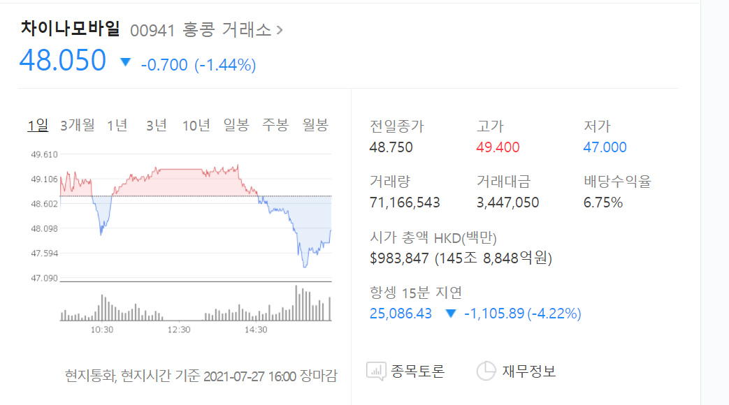 오늘 중국 증시가 폭락했지만, 그나마 차이나 모바일은 높은 방어율을 보여주었다.