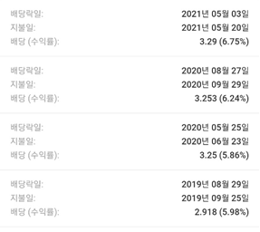 2019년 하반기부터 배당액은 상승 중. 주가도 떨어졌기 때문에 배당수익률도 크게 증가했다.