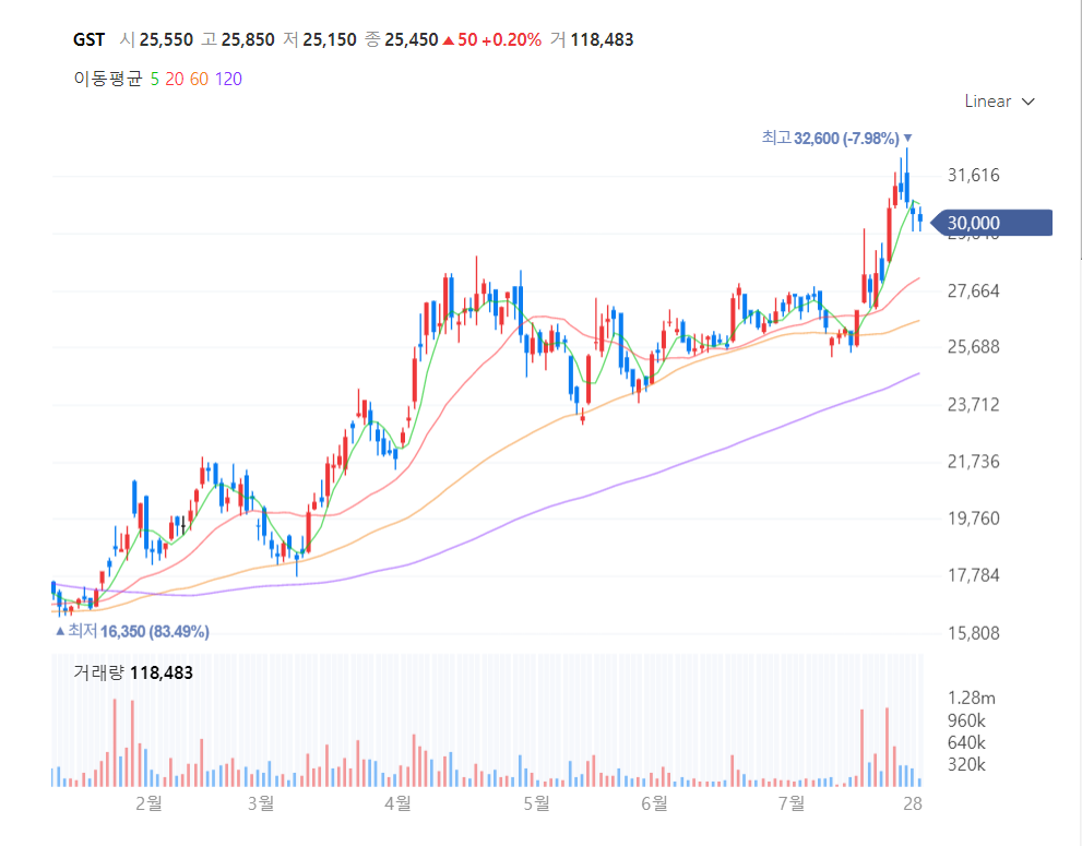 이 때 당시의 GST 주가는 25,000원이고 지금은 30,000원이니 그 떄 이후로도 약 15%가 상승하는 모습을 보여주었네요. 아무리 성장성이 좋은 기업이라도 너무 단기간에 오르면 빠지긴 빠지겠죠. 지금은 그 조정 구간이고 다시 한번 상승하는 모습을 보여줄 것으로 생각합니다.