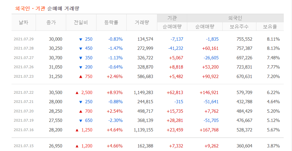7월달 들어 외국인들이 크게 지분을 늘렸습니다. 그리고 조정을 받는 오늘은 기관 및 외국인 모두 약간씩(그것도 엄청 조금의 물량만...) 매도하는 모습.
