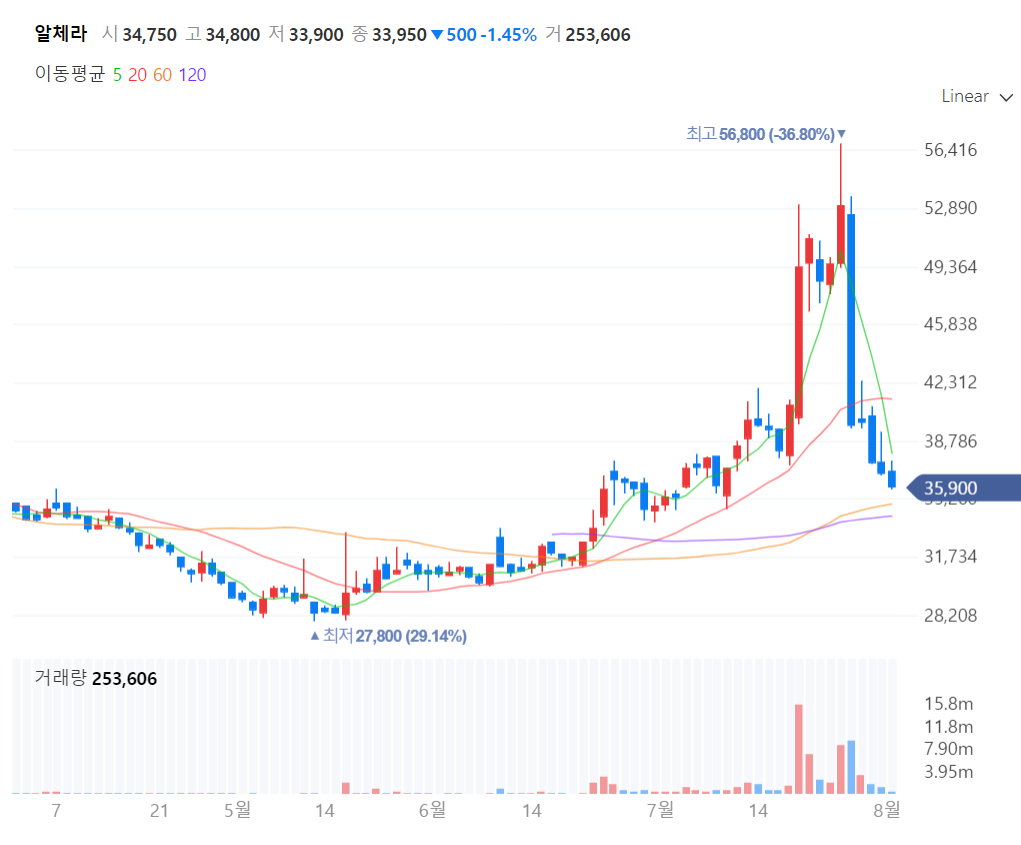 알체라는 한 때 메타버스 대장주로 불리며, 주가가 저점에서 2배 정도 순식간에 뛰었지만, 알체라에서 우리는 메타버스 관련한 사업을 하고 있지 않습니다. 라는 공시가 발표되며, 하한가를 맞고 현재는 고점 대비 50%이상 하락했다.