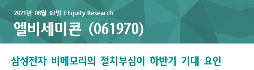 오늘 알아볼 기업은 엘비세미콘인데요. 슈퍼개미 김정환TV에 자주 등장하는 기업이기도 하죠. 이 기업에 대해 관심이 생겨, 관련 리포트를 찾아보았습니다. 비교적 최근인 하나금융투자에서 7월 31일에 발간된 리포트 입니다.