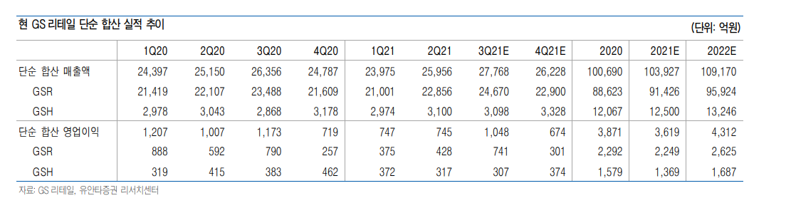 한편, 합병 전 GS홈쇼핑은 2분기 취급고 11,772억원(+3.8% YoY), 영업이익 317억원(-23.6% YoY)를 기록했다. 이 역시 당사의 기존 전망치(450억원)을 크게 하회한 실적이다. 코로나19에 따른 상품 믹스의 변화에 따른 GPM 개선 효과가 정상화의 과정에서 역기저로 다가오며, GPM이 전년 대비 -0.4%p 감소하였으며 판촉비(+60억원 YoY)와 송출료(+63억원 YoY) 등 비용 증가 요인 에 따라 실적이 부진하였다.