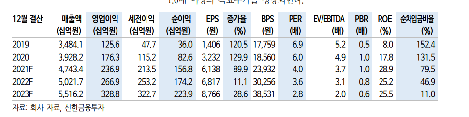 2021년 영업이익은 2135억원 예상. 현재 시가 총액은 6,000억원대로 밸류에이션 PER는 약 4.0 수준.