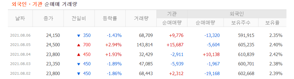 최근에는 기관에서 조금씩 매수를 하는 모습. 외국인은 매도를 많이 했습니다.