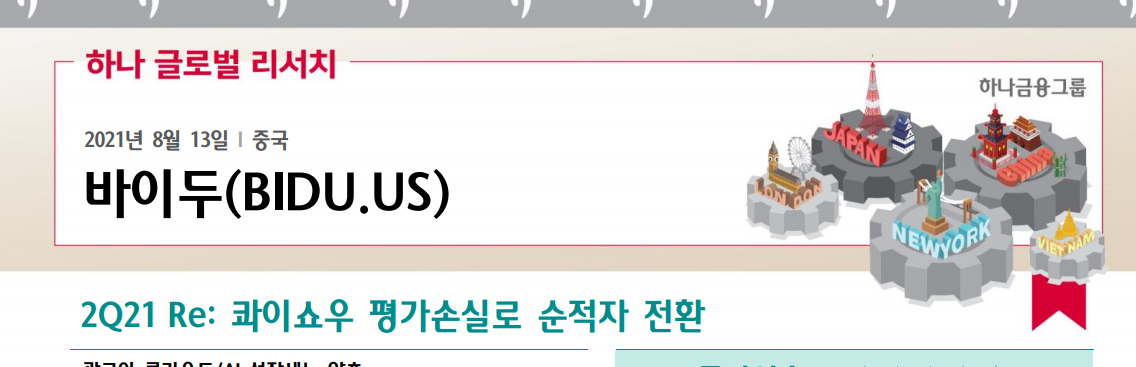 10개 분기 만에 적자를 발표해서, 주가가 3%정도 급락하고 그 이후에도 계속해서 하락하는 모습을 보여주고 있는데요. 관련해서, 어떤 내용들이 발표되었는지 알아봐야겠죠? 하나금융투자에서 바이두 실적 관련 리포트를 발간해서 같이 살펴보겠습니다.