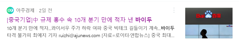 바이두가 지분 투자한 콰이쇼우 주가가 2월 고점 대비 50% 이상 조정받으며 평가손실 36억위안이 반영되었기 때문이다.