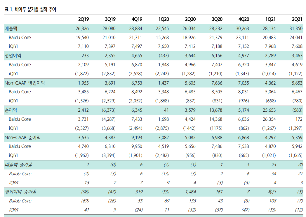 바이두의 2분기 매출액은 313.5억위안(YoY +20%), 조정 순이익은 53.6억위안(YoY +5%)으로 컨센서스를 각각 1%/17% 상회했 지만, GAAP 기준 순손실이 5.8억위안을 기록.